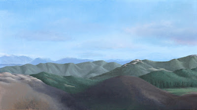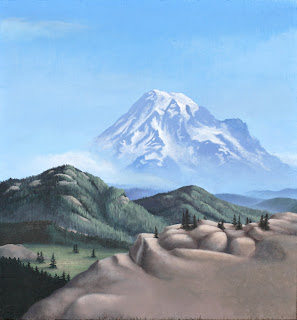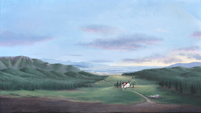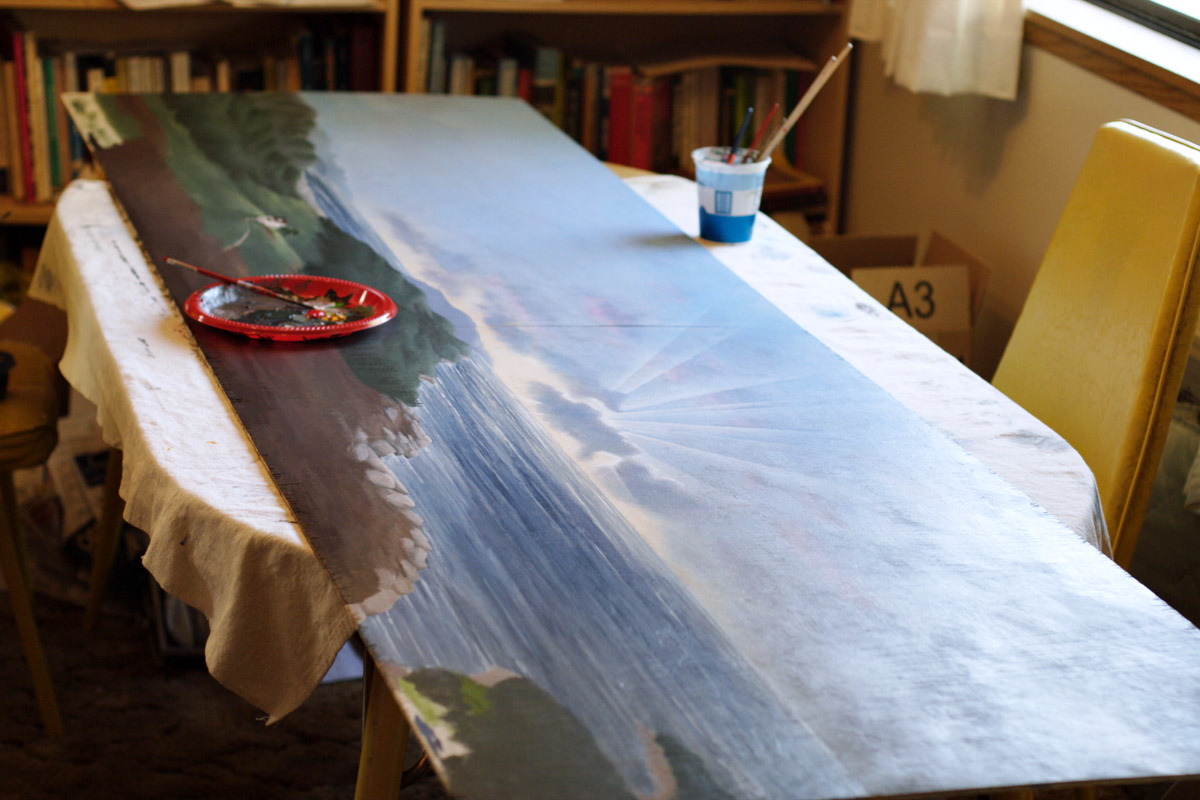 Sylvia got a couple of the neighbors to come over, and we were standing there looking at the painting and discussing how part of it reminded them of Cambria, California where they used to live (I didn't know I was painting California) when Jerry came home a little earlier than expected. He walked into the train room where we were all standing, and Sylvia kind of gasped and said, "Oh! You're back!" Then the neighbor said, "Hey Jerry, we were just checking out your train table--it's got a big crack in it! You're going to have to fix this. Come take a look at it."