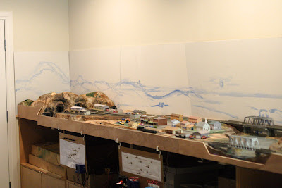 The train table is kind of a work in progress (it needs more trees and things--and that white stuff that you can see in the photo is some repair work from the move). It'll be fun to see what Jerry does with it now that he's got the backdrop to pull it all together.